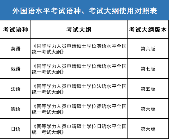 以同等學(xué)力申請碩士學(xué)位人員(以下簡稱同等學(xué)力人員)須參加外國語水平考試,應(yīng)試語種應(yīng)與申請學(xué)位相應(yīng)學(xué)科在校碩士研究生培養(yǎng)方案規(guī)定的語種相同。全國統(tǒng)一組織的外國語水平考試主要語種為英語、俄語、法語、德語和日語,考試大綱見附件1。