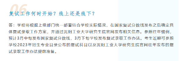 沈陽工業(yè)大學官方公眾號發(fā)布:預計3月中旬發(fā)布國家復試分數(shù)線,3月下旬學校發(fā)布復試錄取工作辦法。