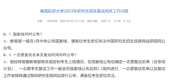 南昌航空大學發(fā)布《南昌航空大學2023年研究生招生復試相關工作問答》,其中說明:教育部一般在3月中旬公布國家線,在國家線公布后確定一志愿復試名單(含專項計劃》,一志愿考生復試工作一般會在國家線公布后的1-2周內進行。