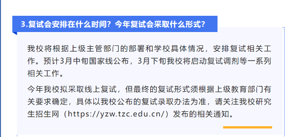 臺州學院官方公眾號于3月4日發(fā)布《臺州學院2023年研究生招生復試常見問題答疑》,其中提到:預計3月中旬國家線公布,3月下旬啟動復試調劑等一系列相關工作,復試形式擬采取線上復試。