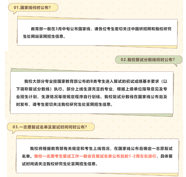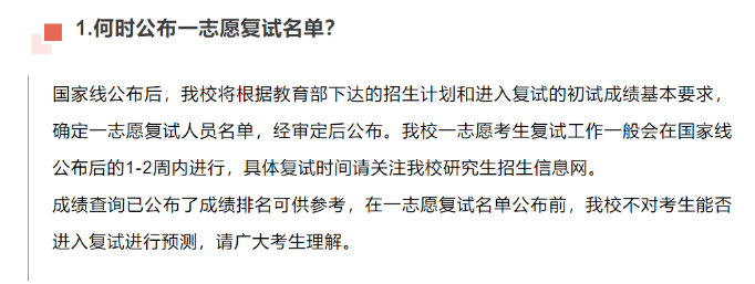 新疆師范大學研究生會官方公眾號于3月2日發(fā)出《新疆師范大學2023年碩士研究生招生熱點問題解答》,提到國家線將于三月中旬公布,復試分數(shù)線將在國家線公布后及時發(fā)布,一志愿考生復試工作一般在復試名單公布后的1-2周左右進行。